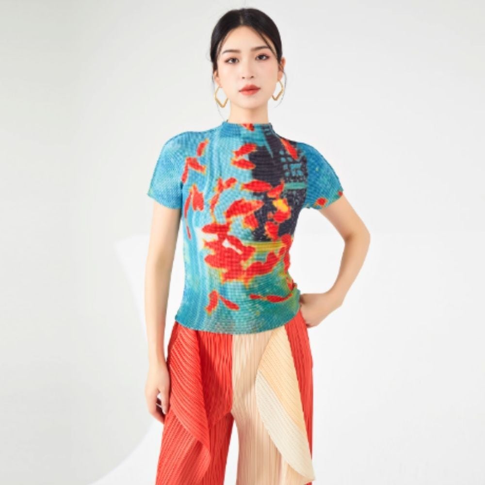 涼しげ 夏服 伸縮トップス 青×赤 アートデザイン 水中モチーフ