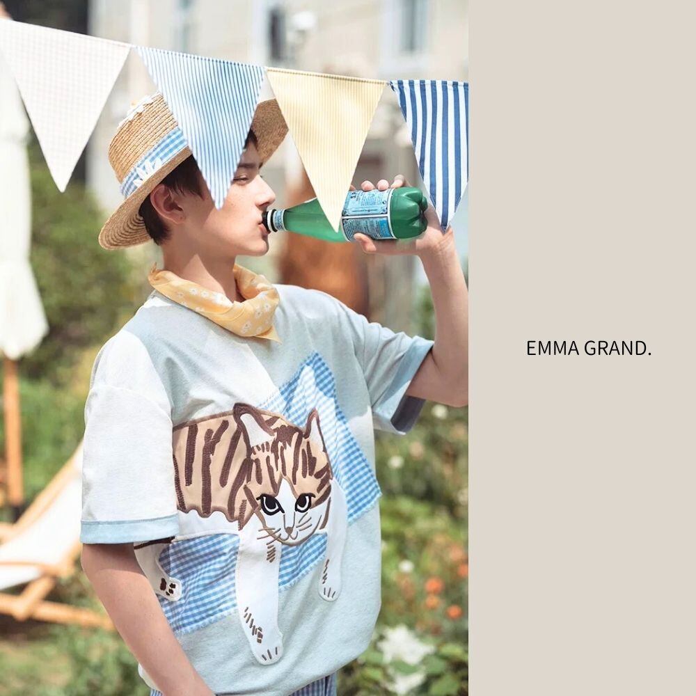 猫Tシャツ、子猫モチーフ、ギンガムチェック、アニマルデザイン、半袖Tシャツ、夏トップス、ユニセックスTシャツ、EMMAGRAND