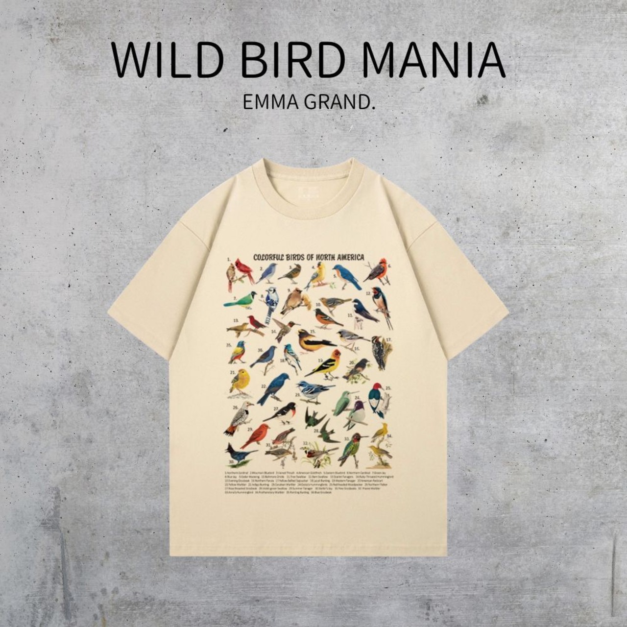 あらゆる種類の鳥が描かれているTシャツ
