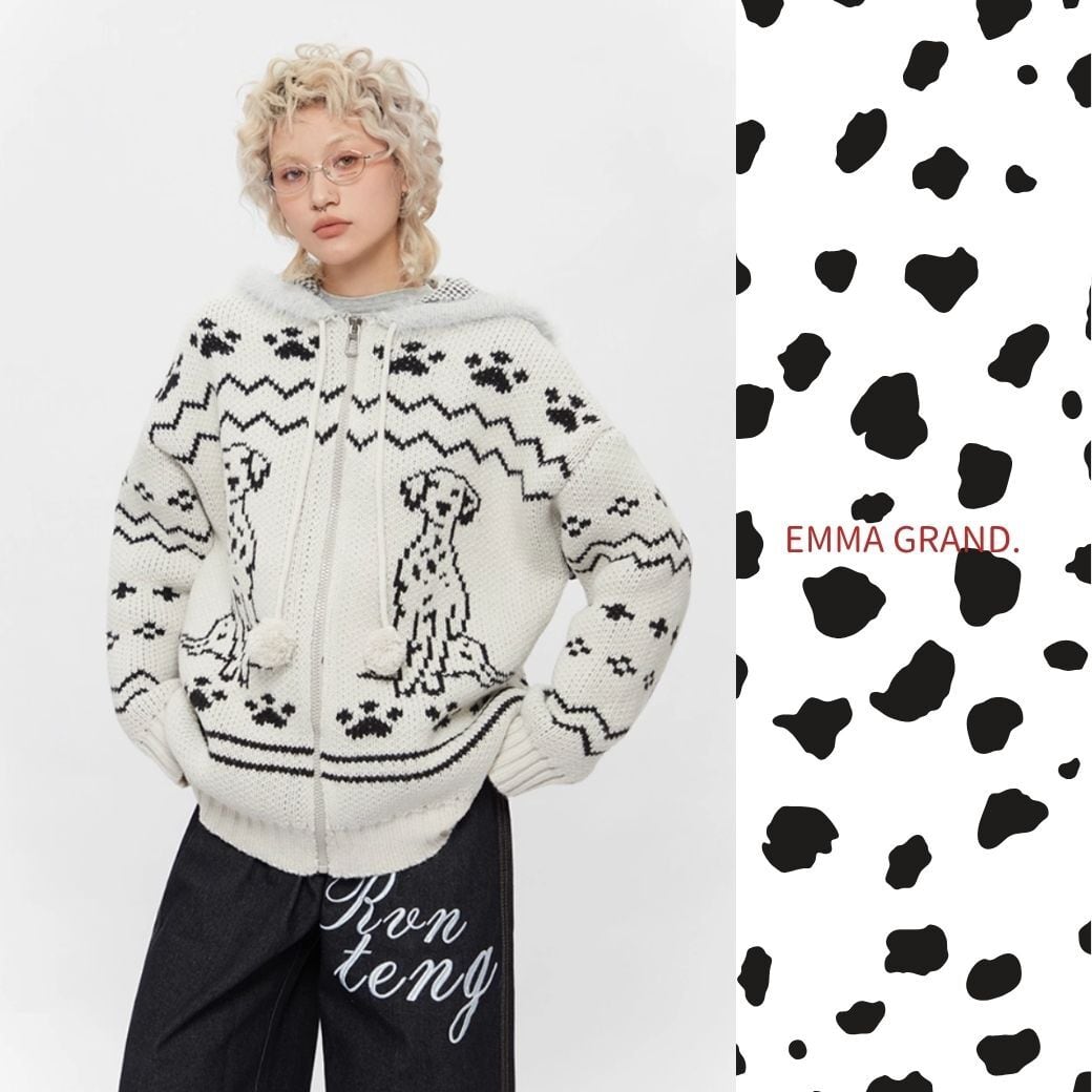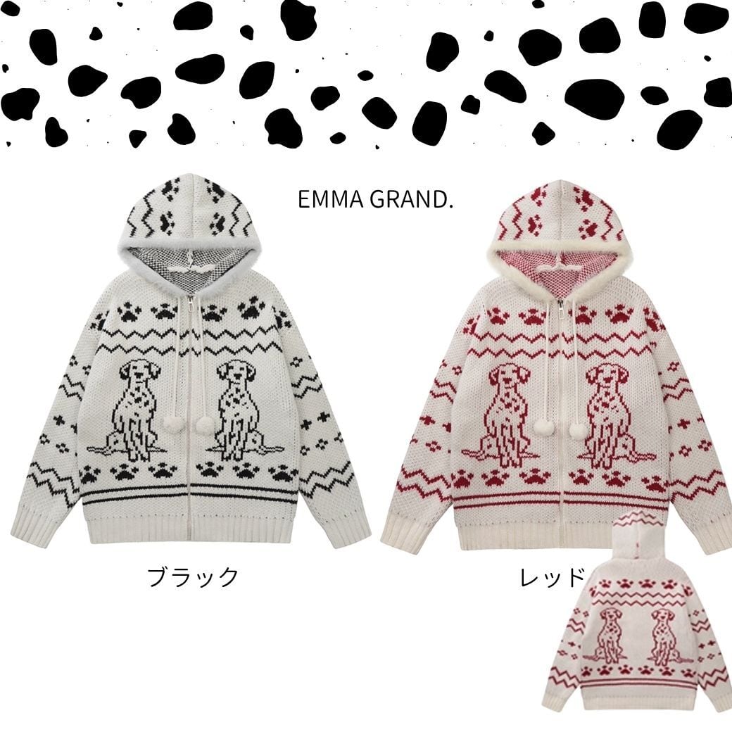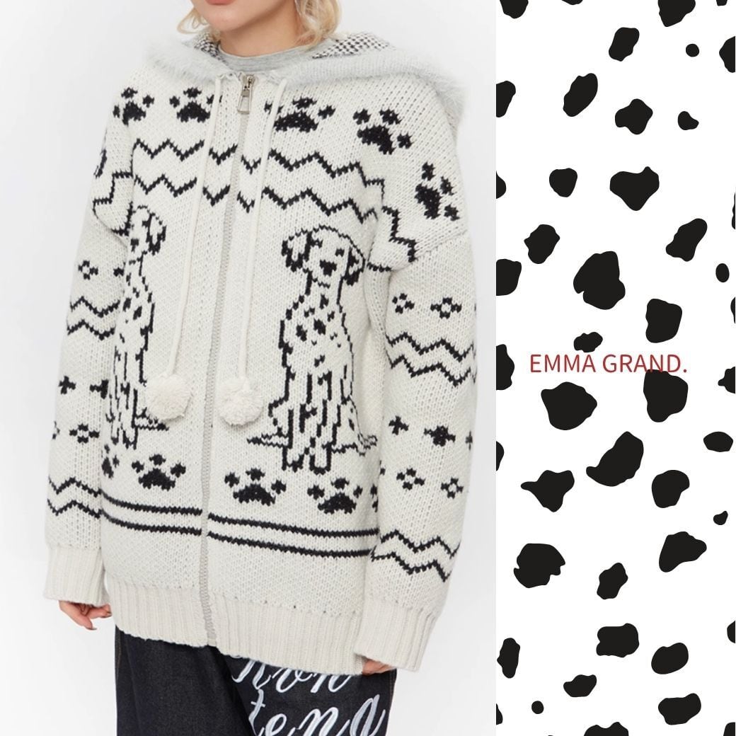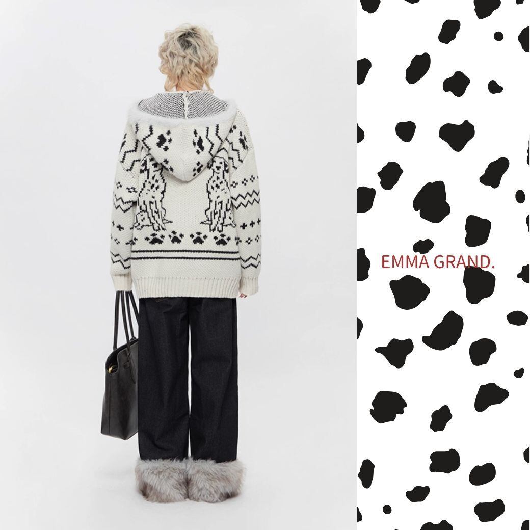 ダルメシアンニット/犬モチーフ/ジップアップパーカー/ユニセックス/モヘアニット/冬トップス/EMMAGRAND