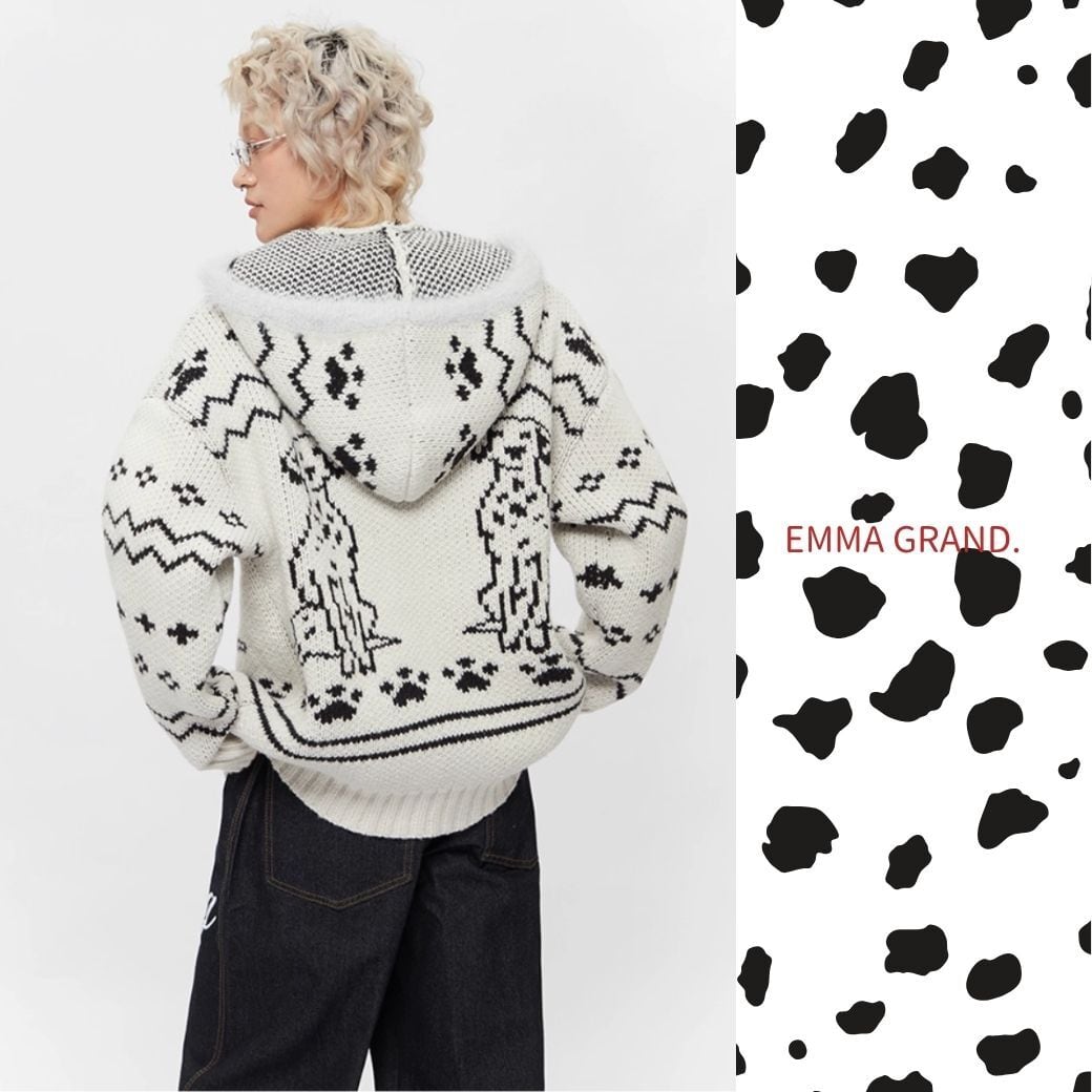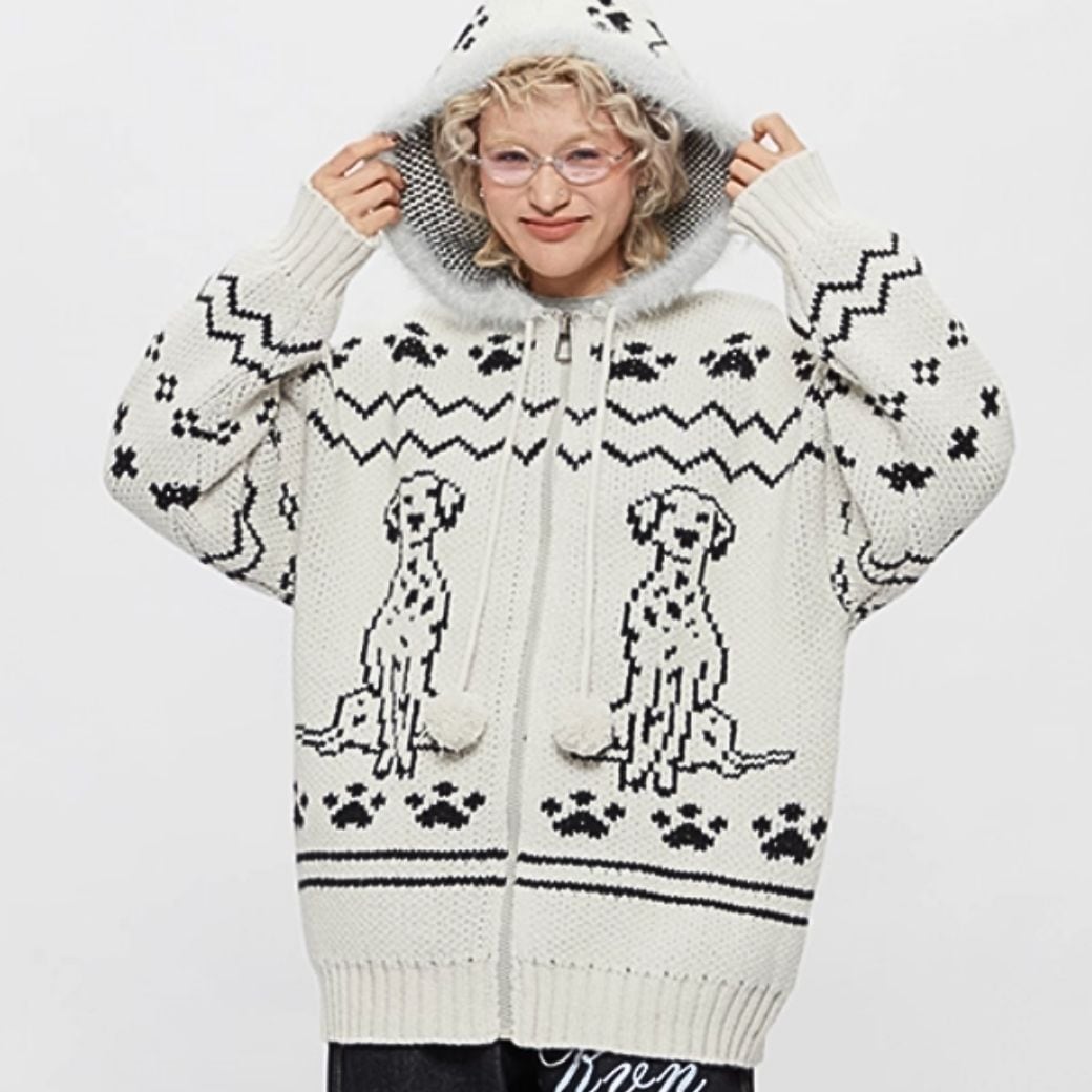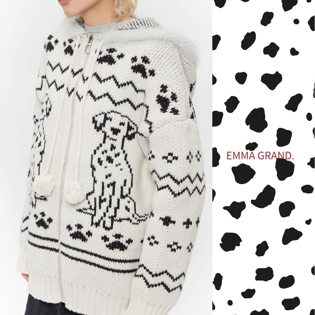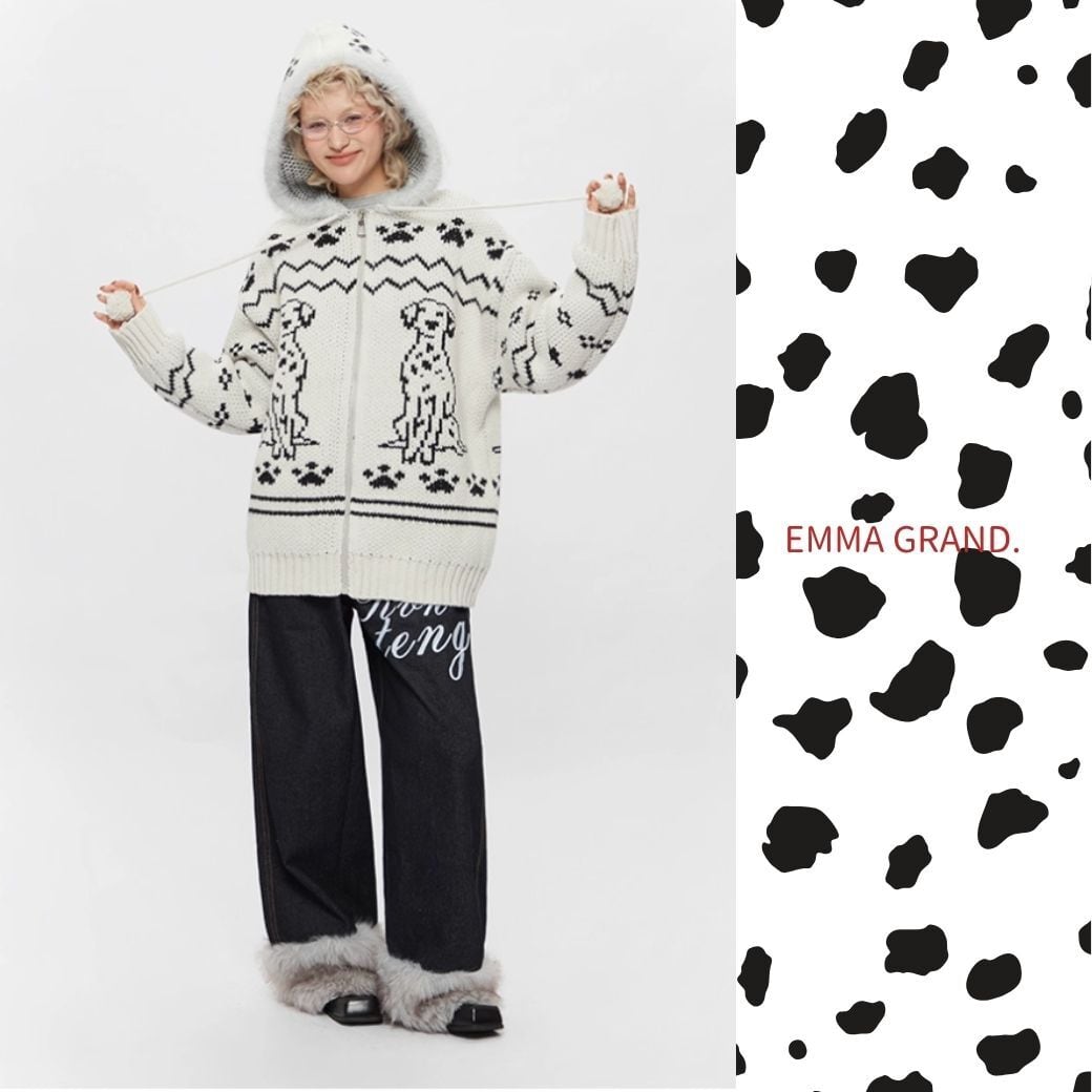 ダルメシアンニット/犬モチーフ/ジップアップパーカー/ユニセックス/モヘアニット/冬トップス/EMMAGRAND