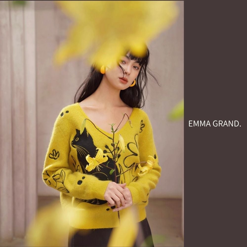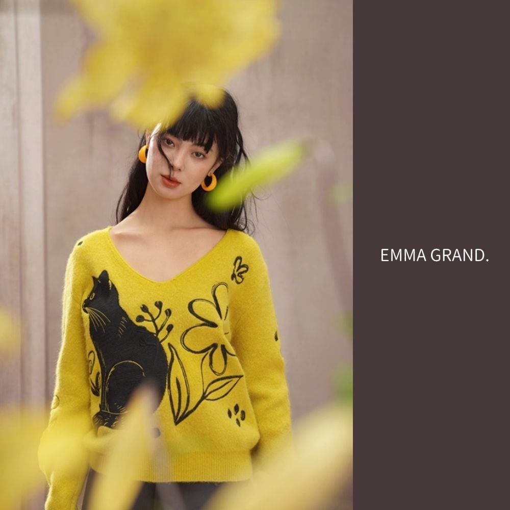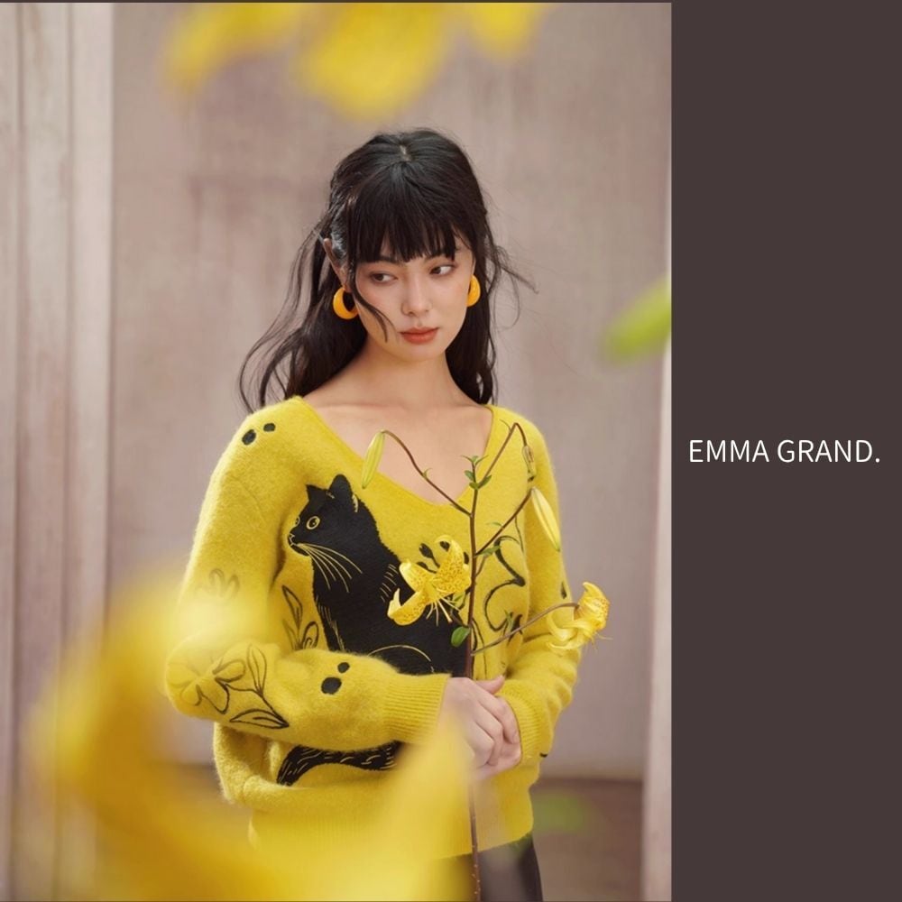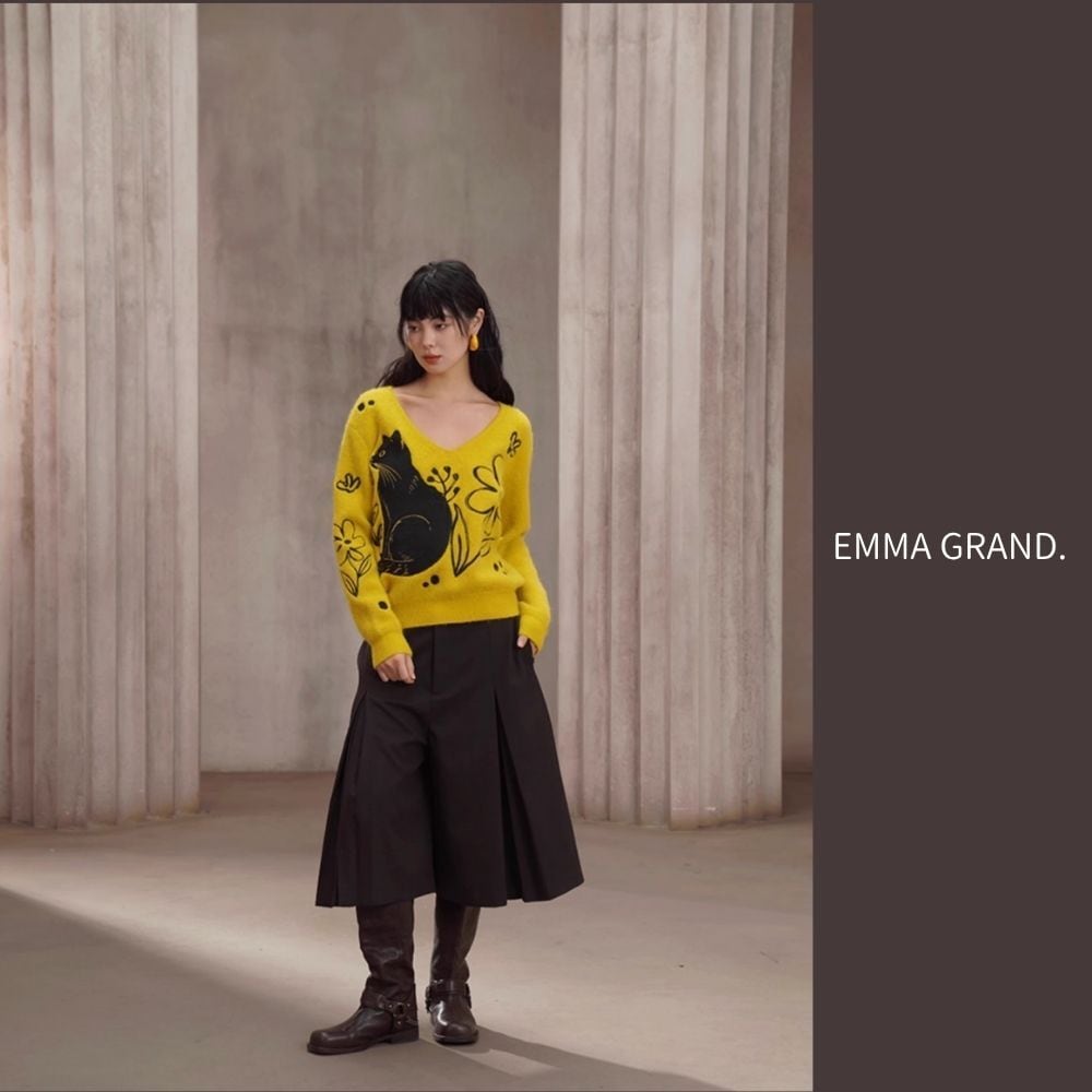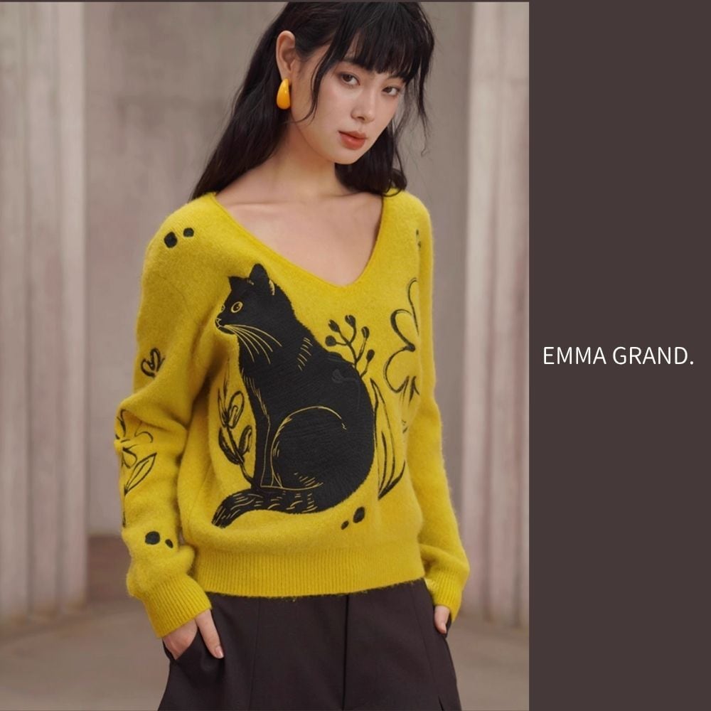 #黒猫ニット #アニマルモチーフ #秋冬コーデ #マスタードニット #Vネックニット #EMMAGRAND #猫好きファッション