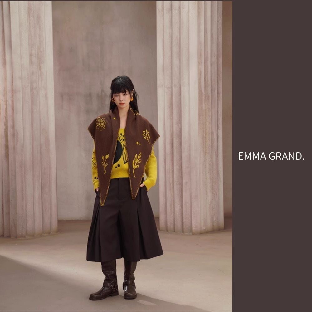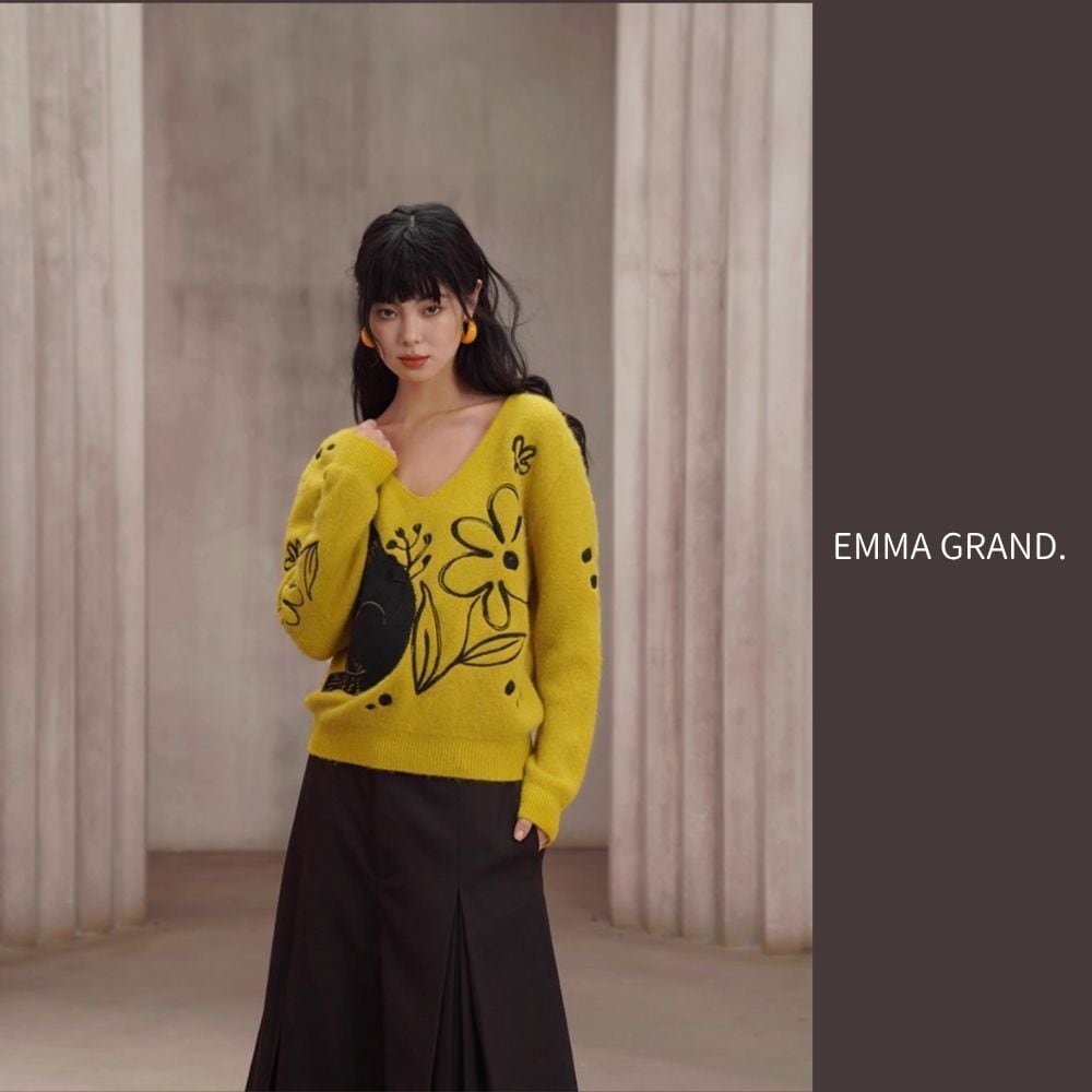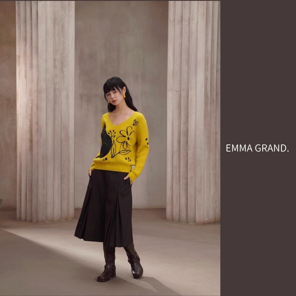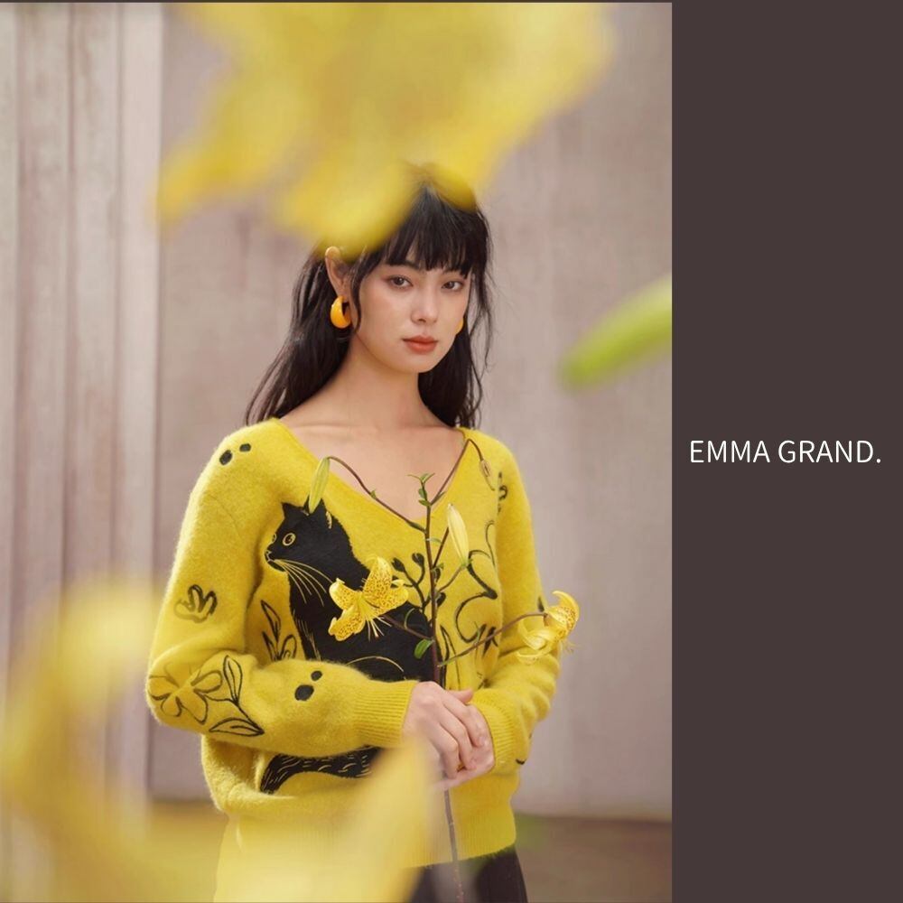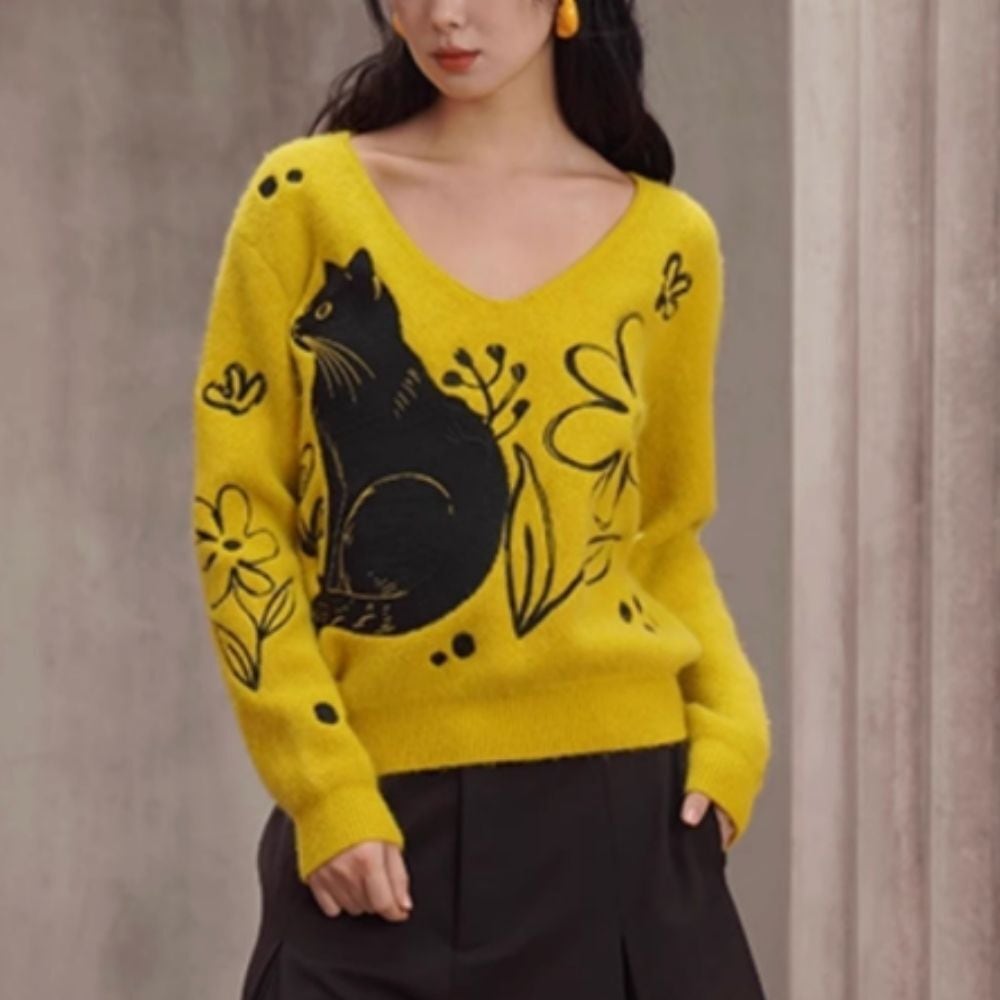 #黒猫ニット #アニマルモチーフ #秋冬コーデ #マスタードニット #Vネックニット #EMMAGRAND #猫好きファッション