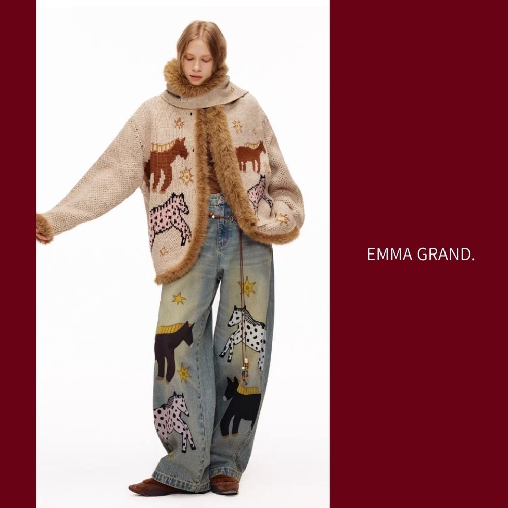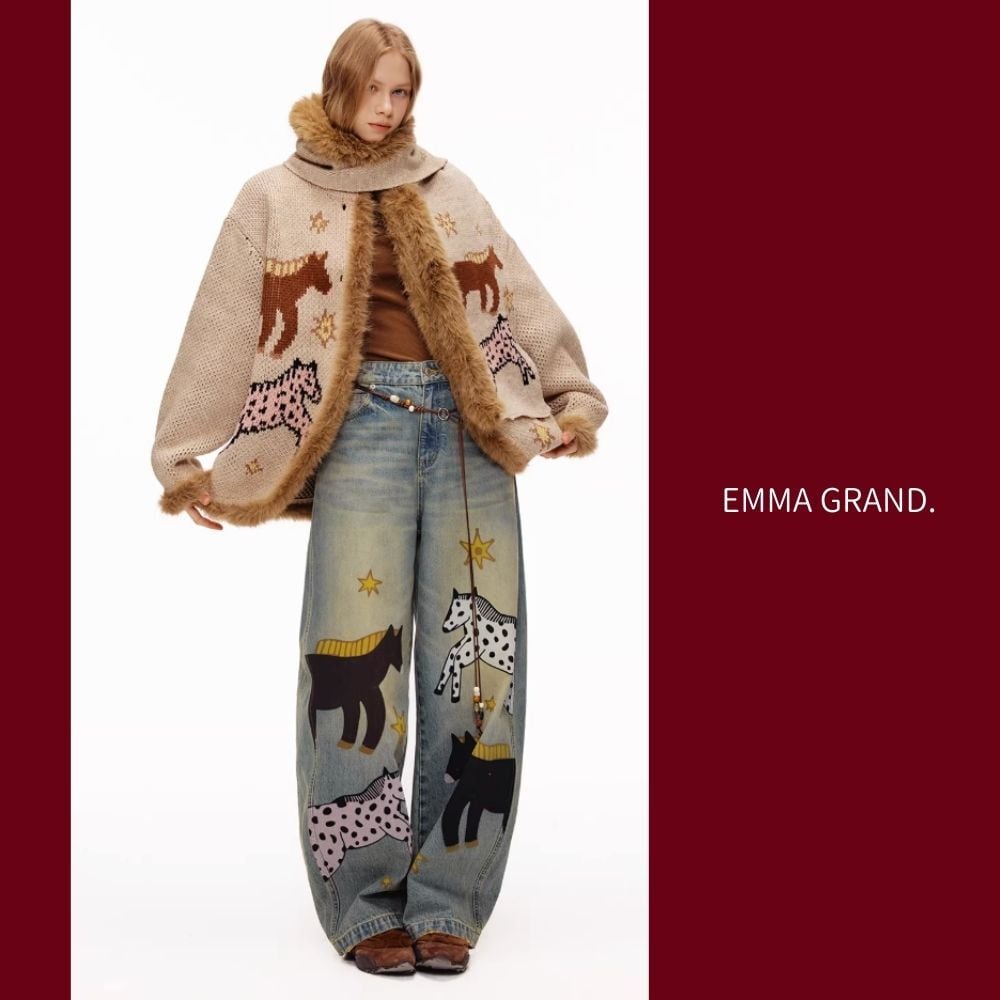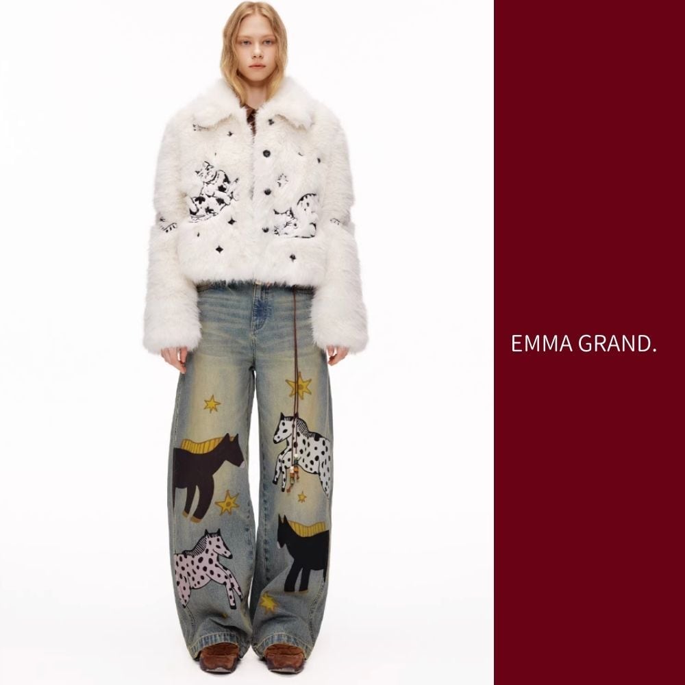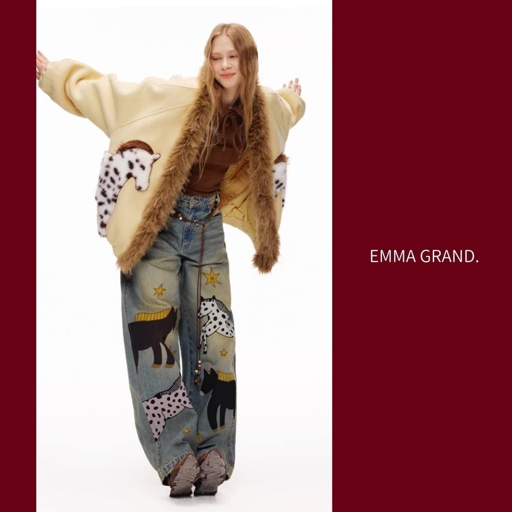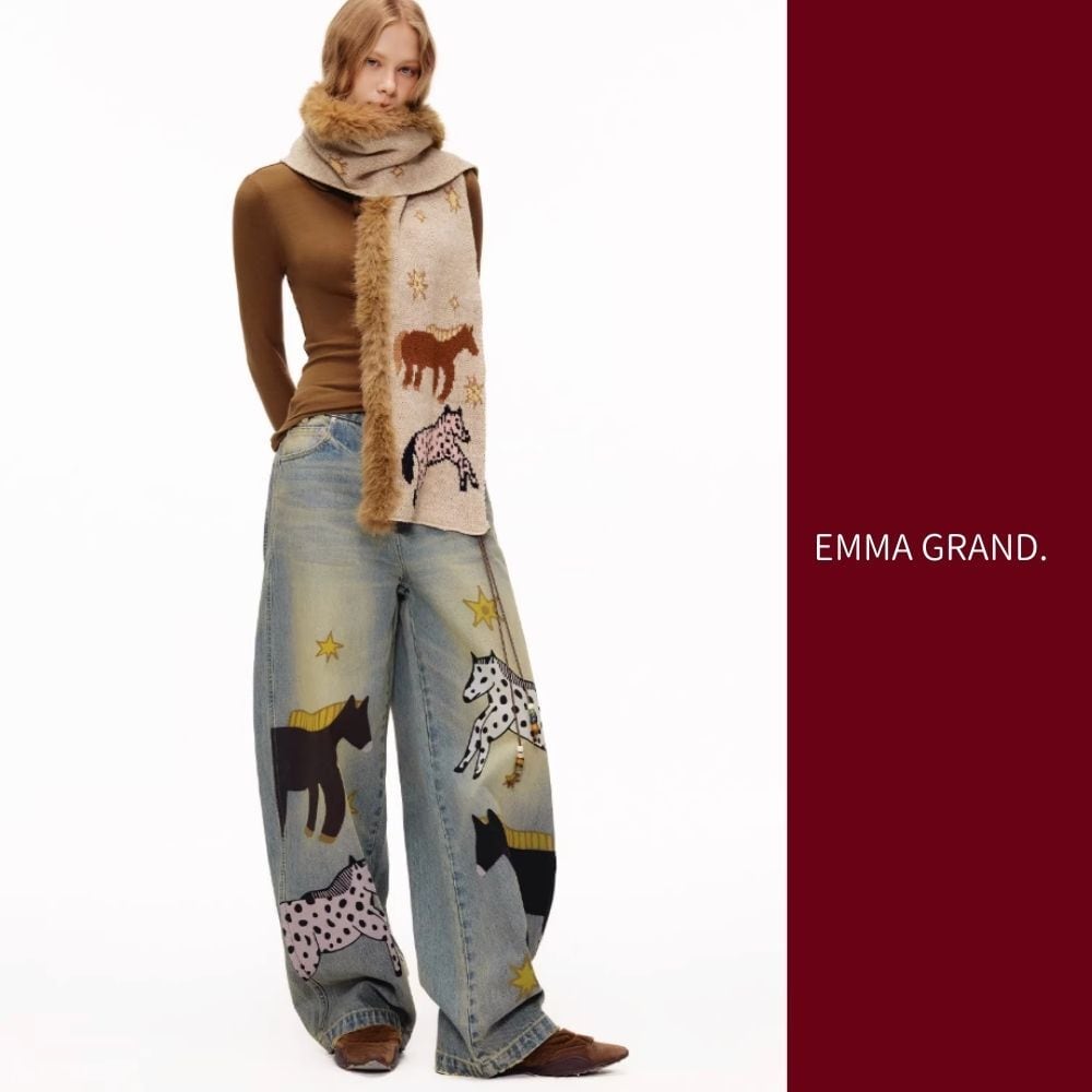 その下を歩く馬たちの影が、デニムの上で物語を紡ぐ一着。