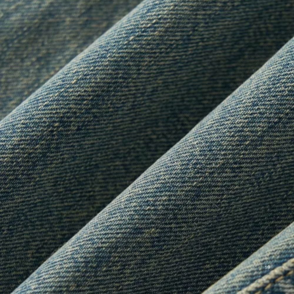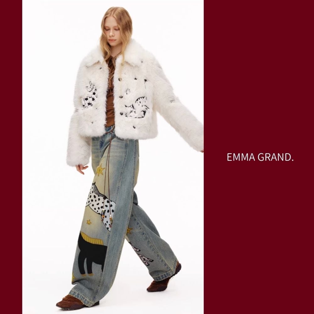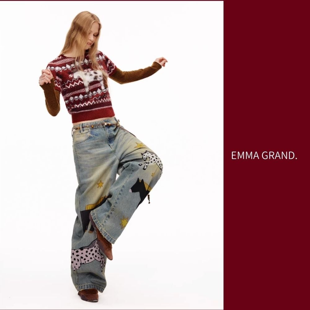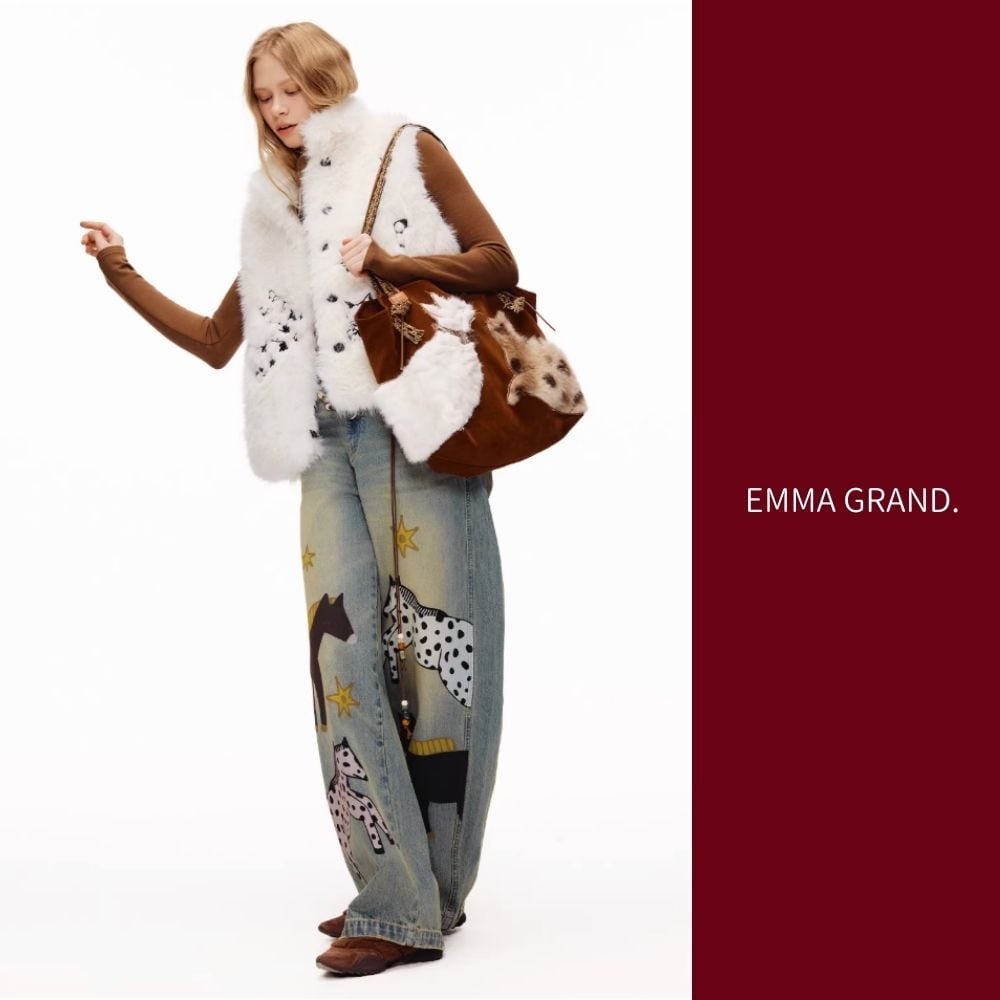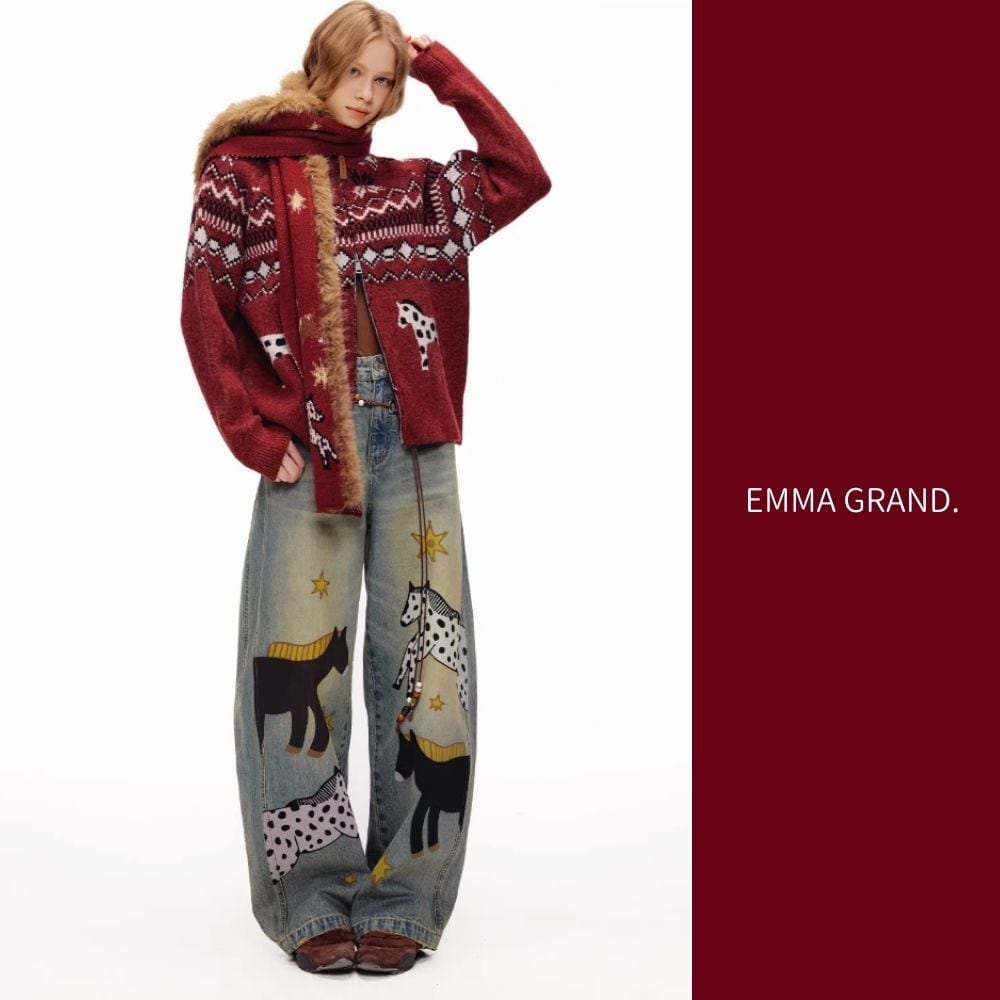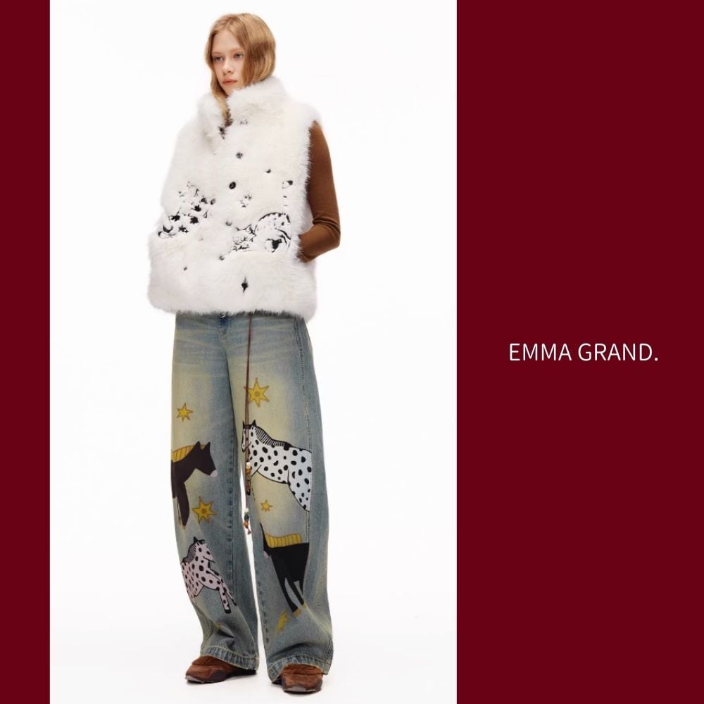 その下を歩く馬たちの影が、デニムの上で物語を紡ぐ一着。