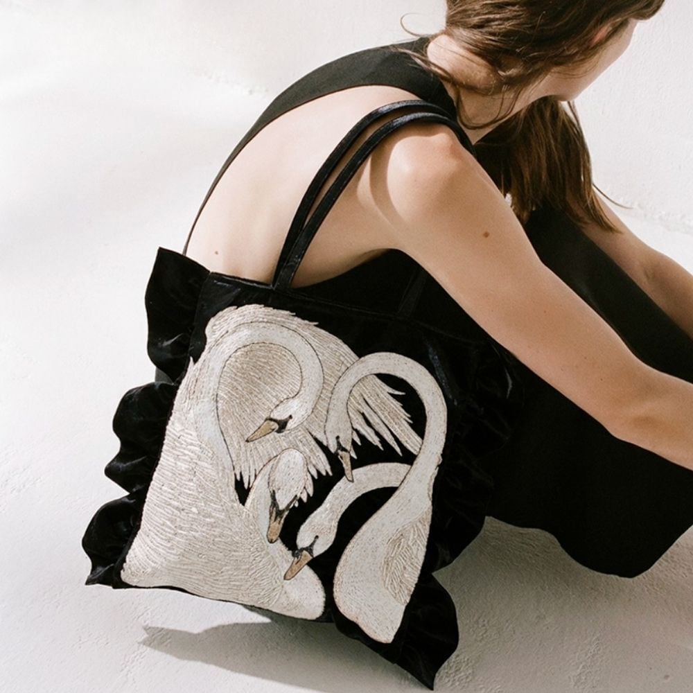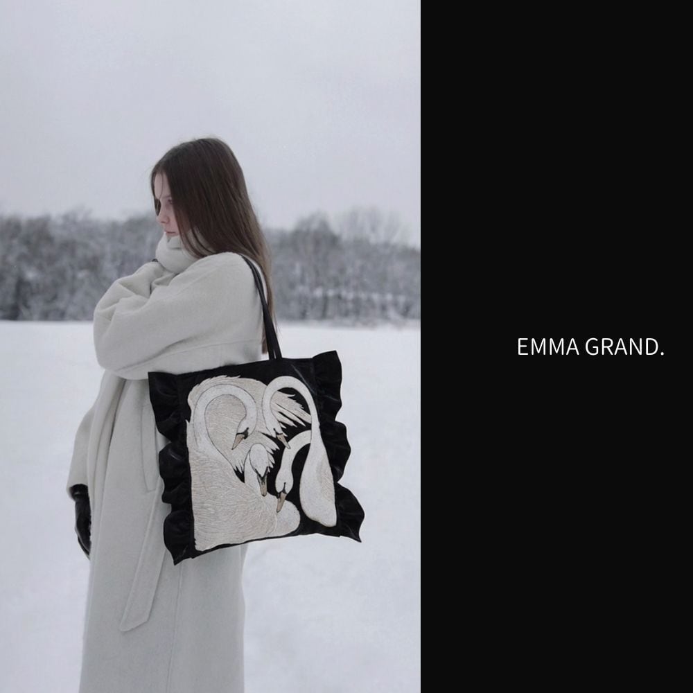 ✽┈┈┈ 白鳥が紡ぐ静寂の湖畔 フリル刺繍トートバッグ ┈┈┈✽