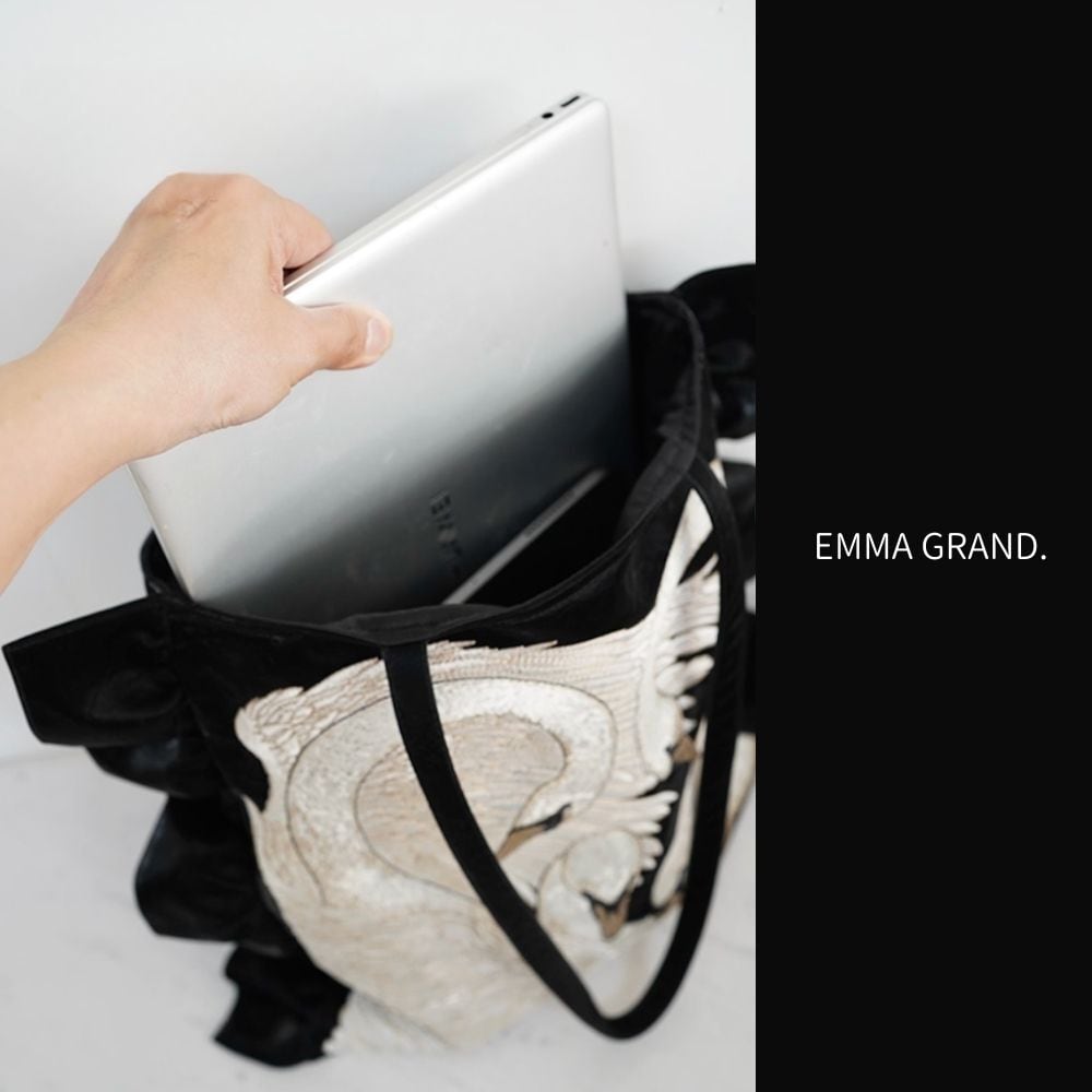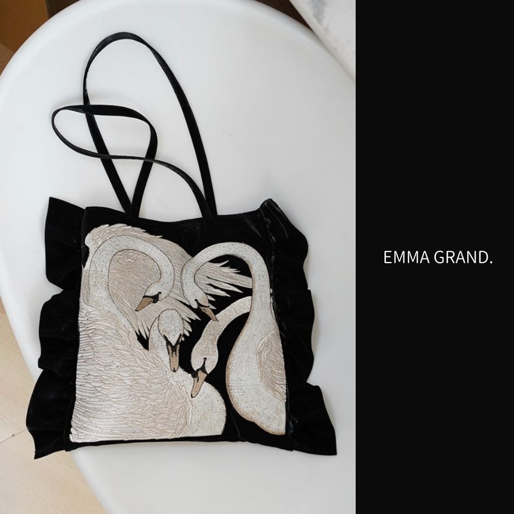 白鳥が紡ぐ静寂の湖畔 フリル刺繍トートバッグ E00639
