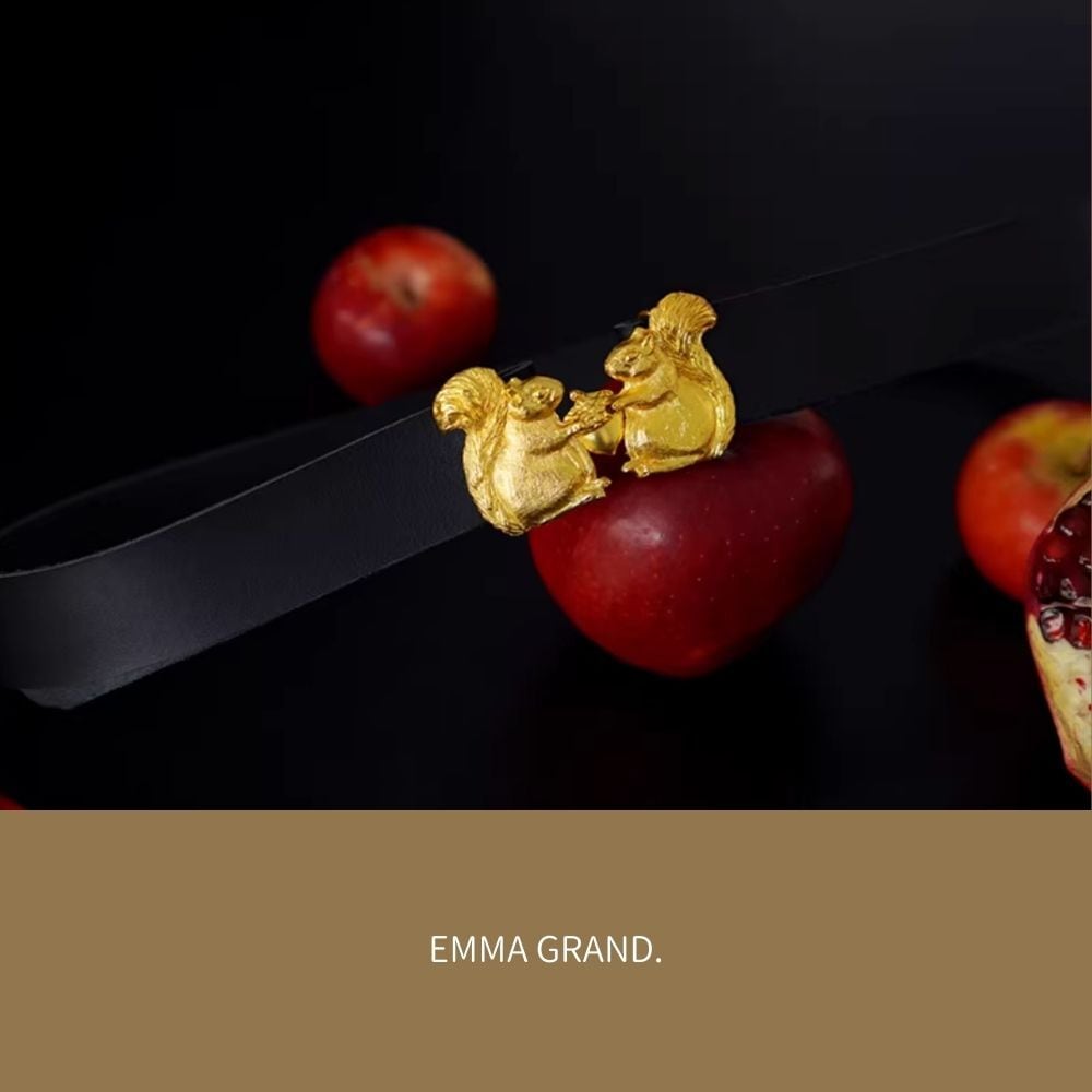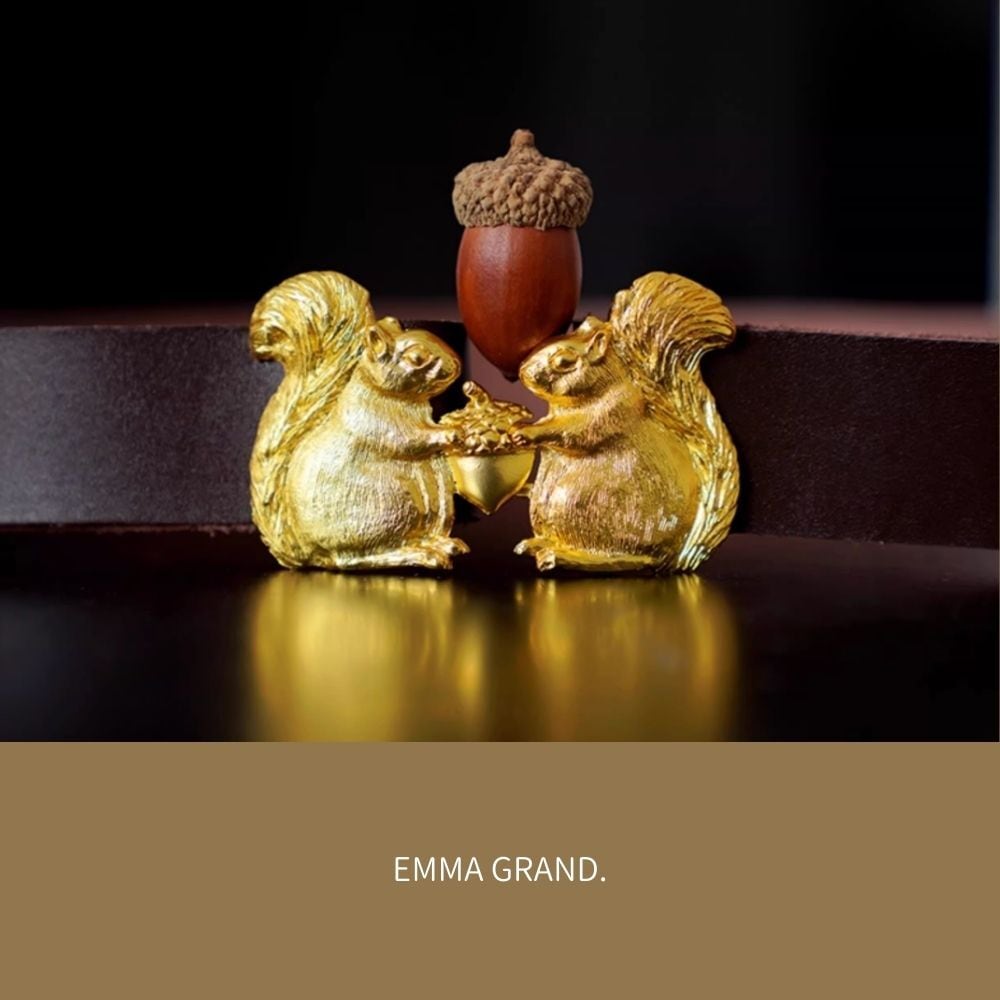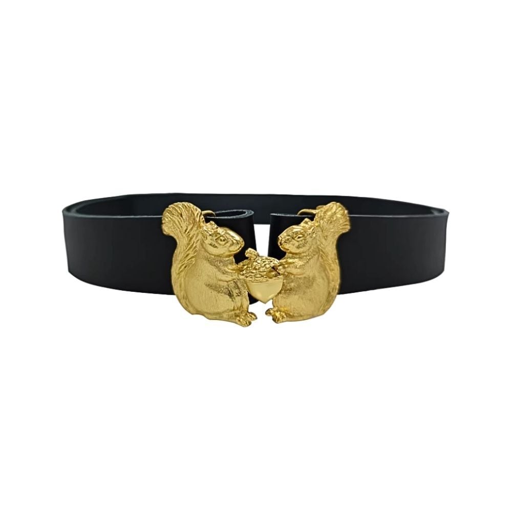 木の実を分かち合う森のリス ゴールドバックルレザーベルト E00642