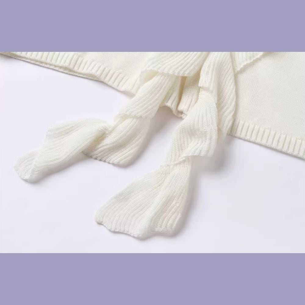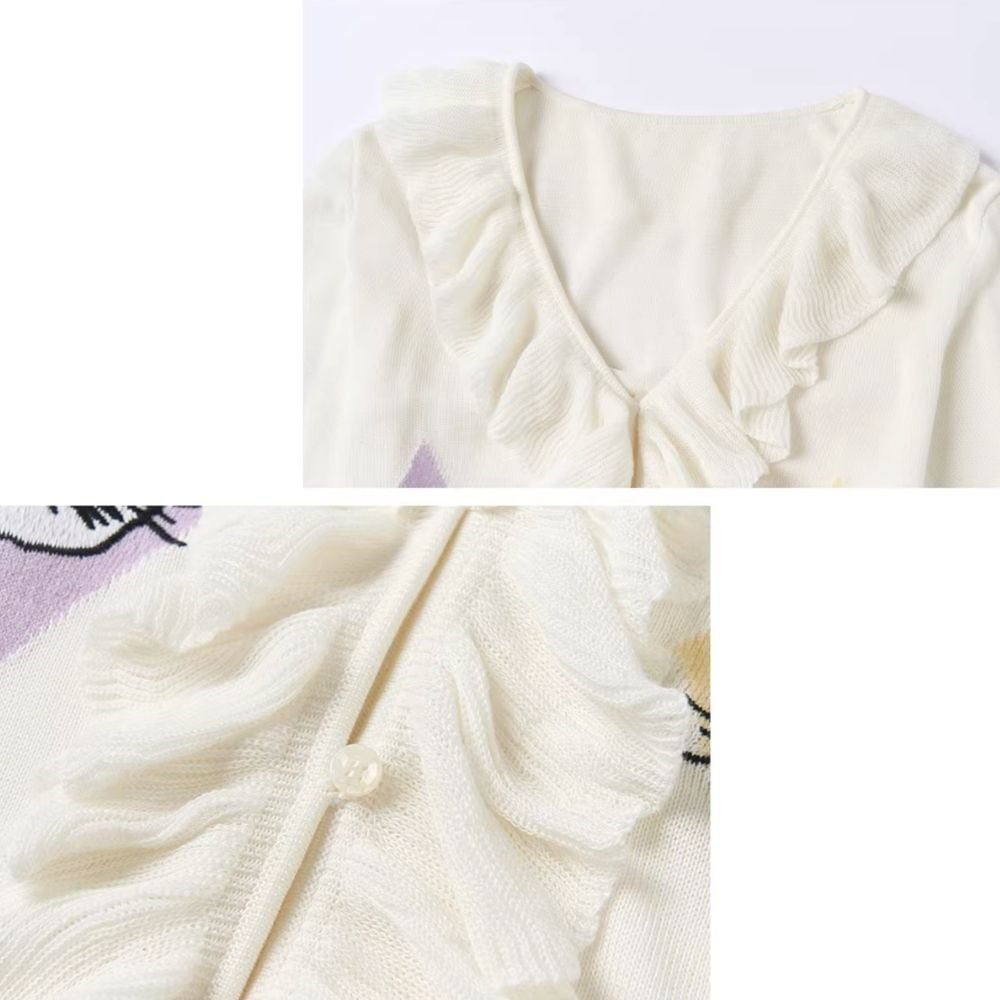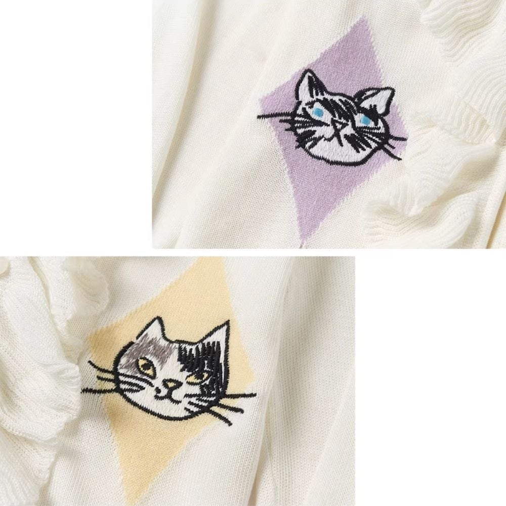 ひし形に遊ぶ猫たちのフリルリボンニットカーディガン E00647