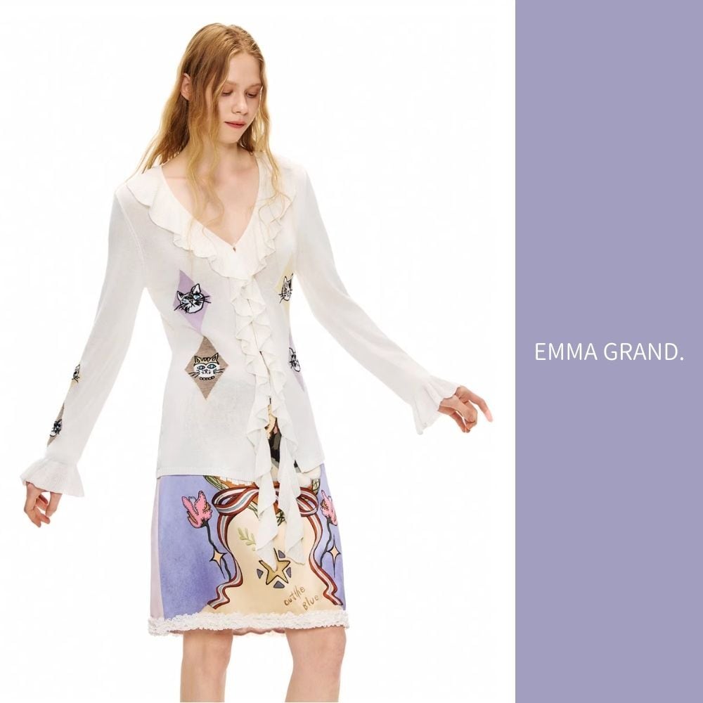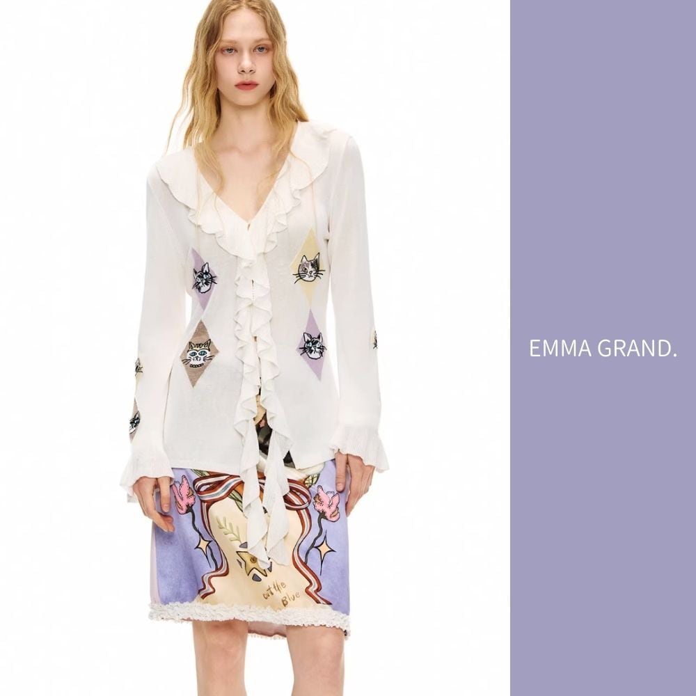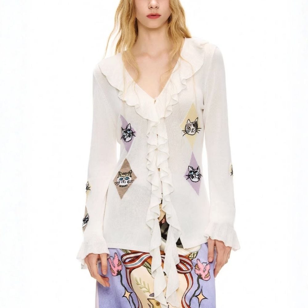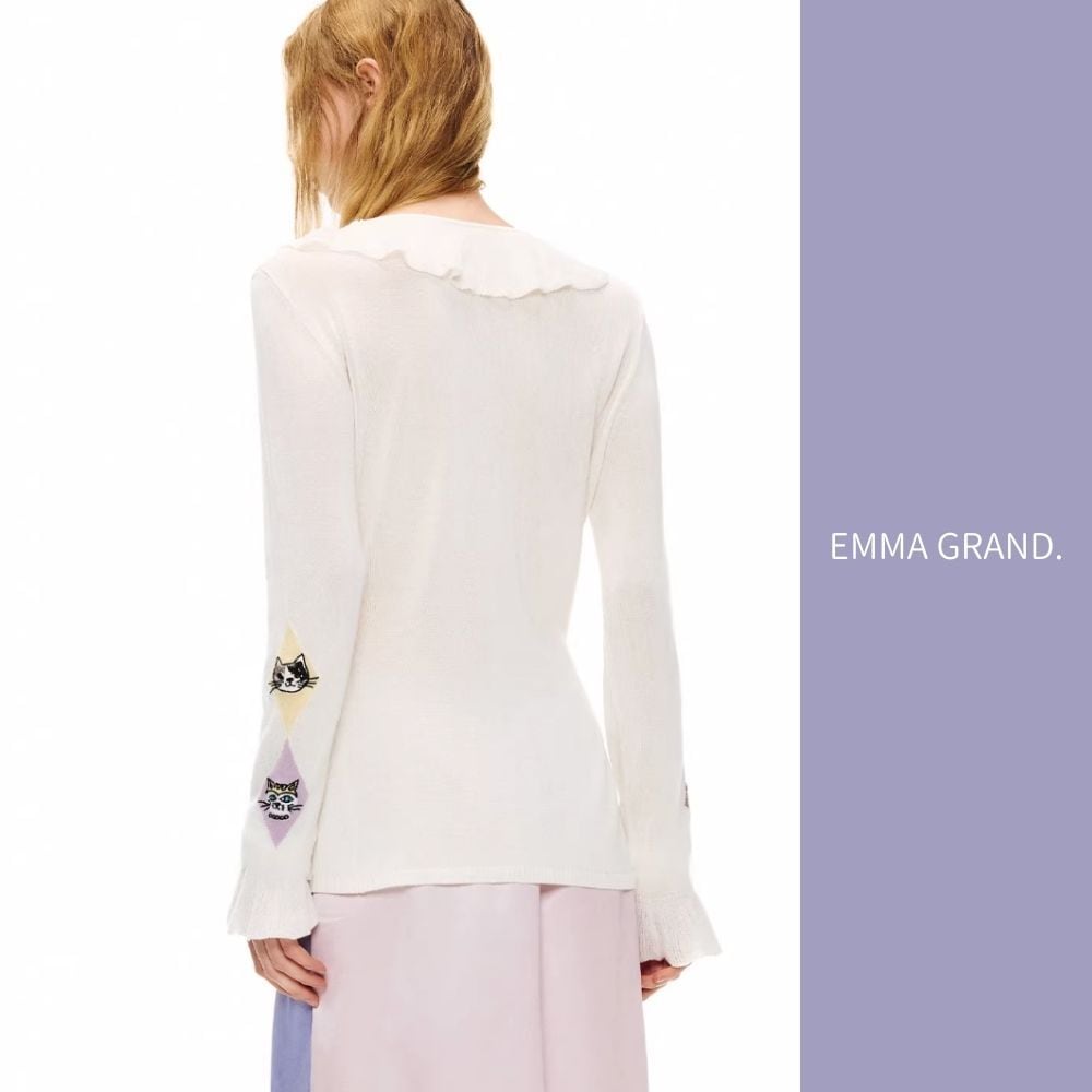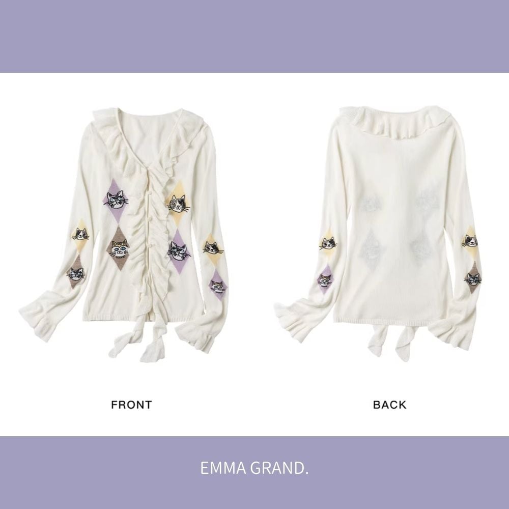 EMMAGRAND 猫 ニット 猫刺繍 カーディガン フリルニット リボンニット アーガイル 猫モチーフ 大人可愛い 春トップス