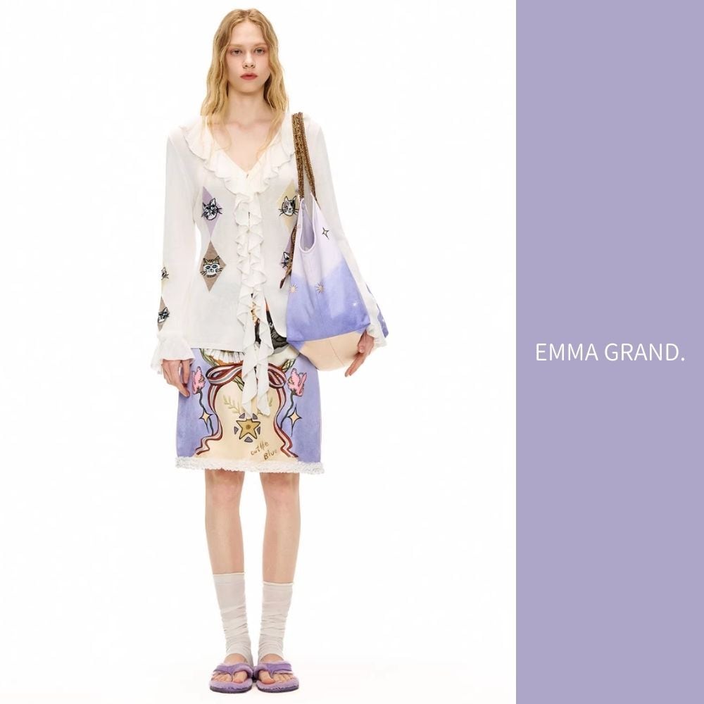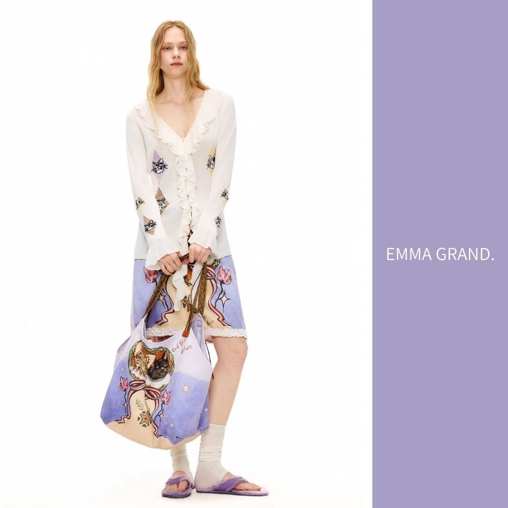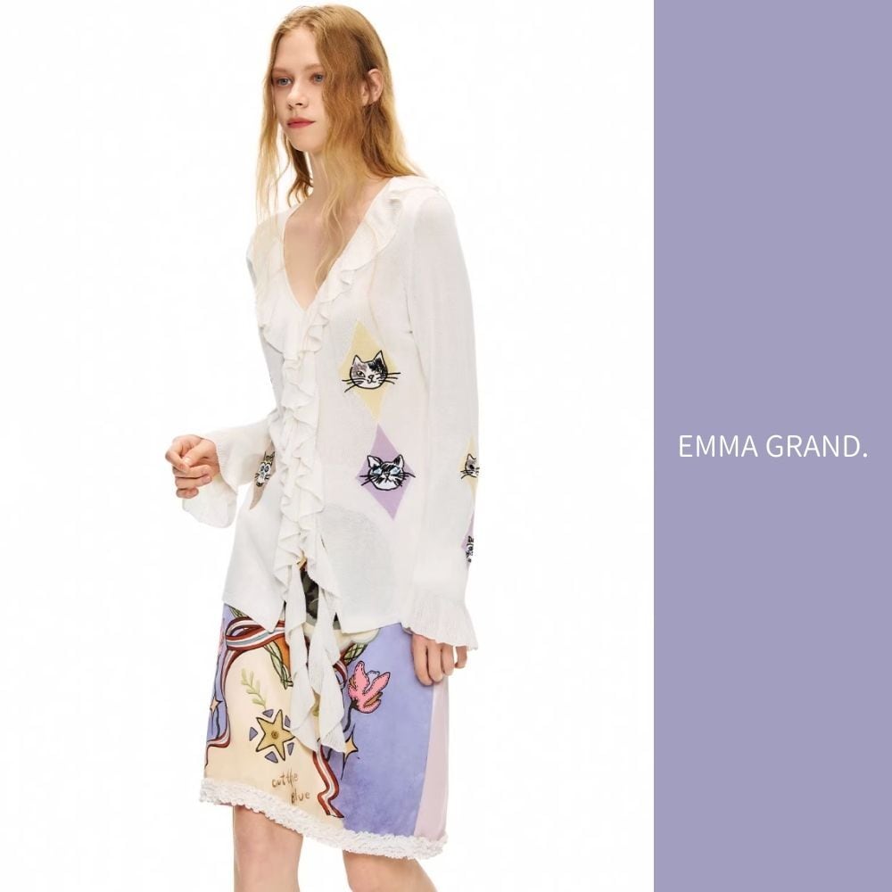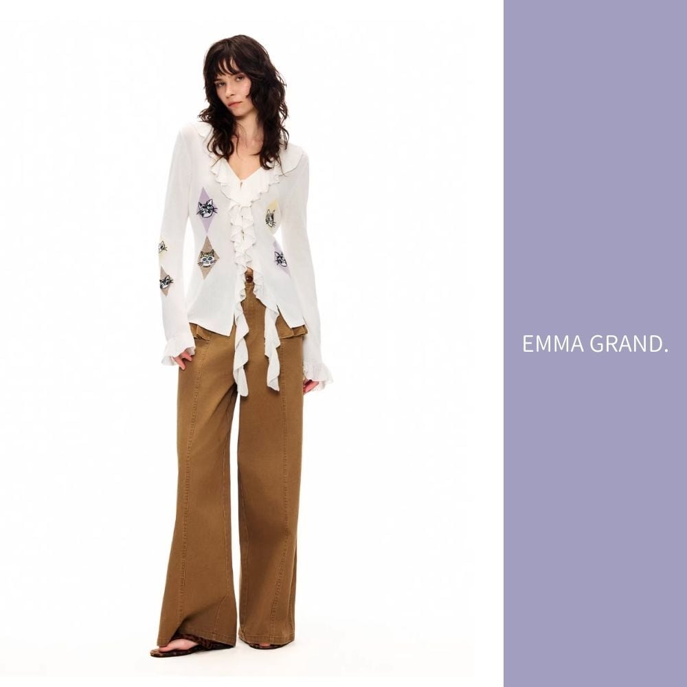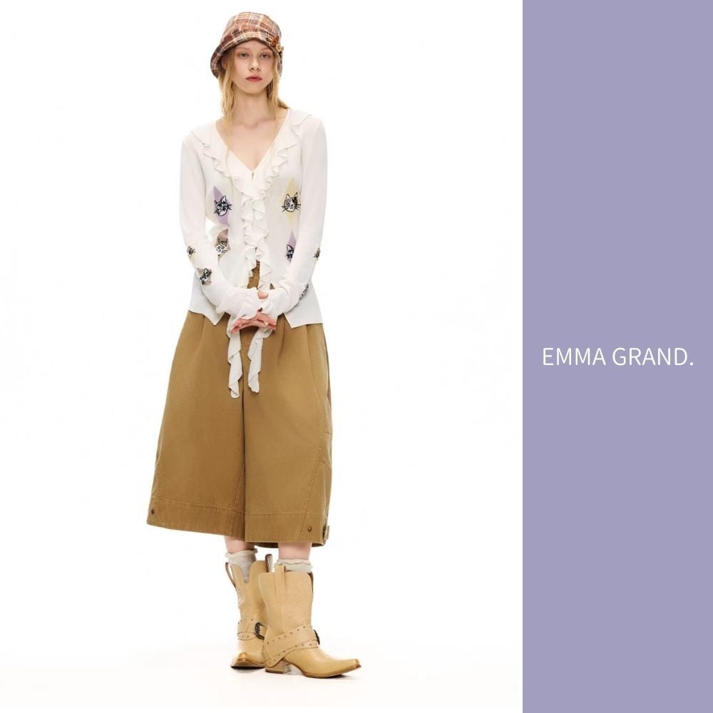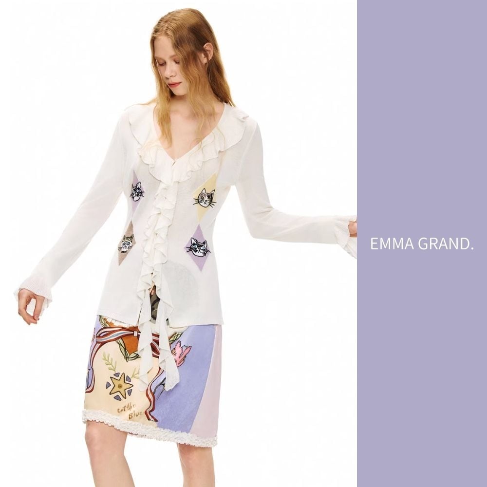 EMMAGRAND 猫 ニット 猫刺繍 カーディガン フリルニット リボンニット アーガイル 猫モチーフ 大人可愛い 春トップス