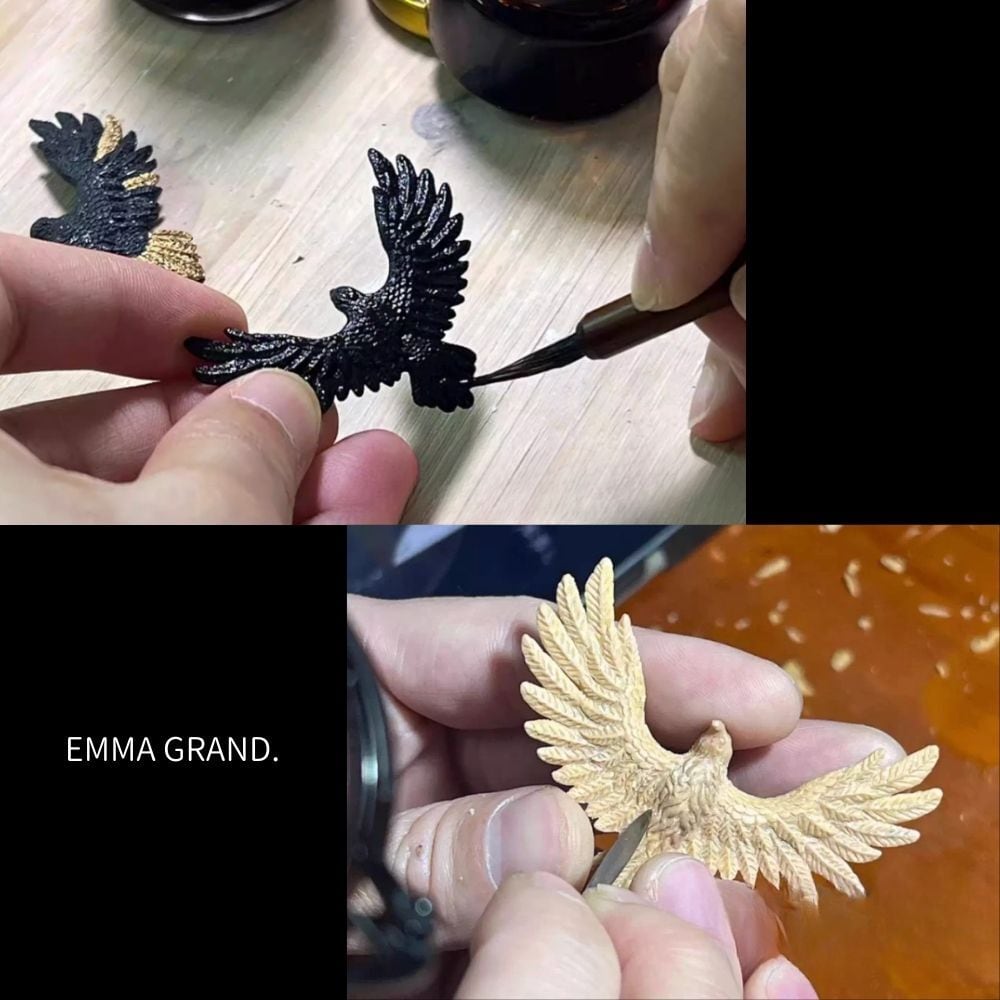 手描きの金彩が翼の一枚一枚に輝きを添えています。