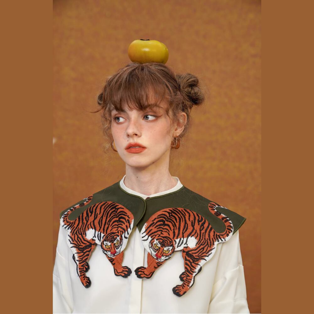 2匹の虎が大きく刺繍されたカーキのケープ