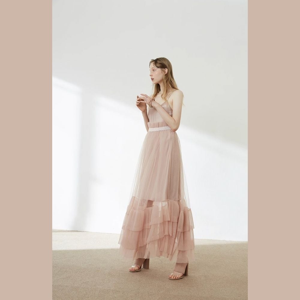 キャミインナーワンピースとエアリー感のあるチュールスカートの