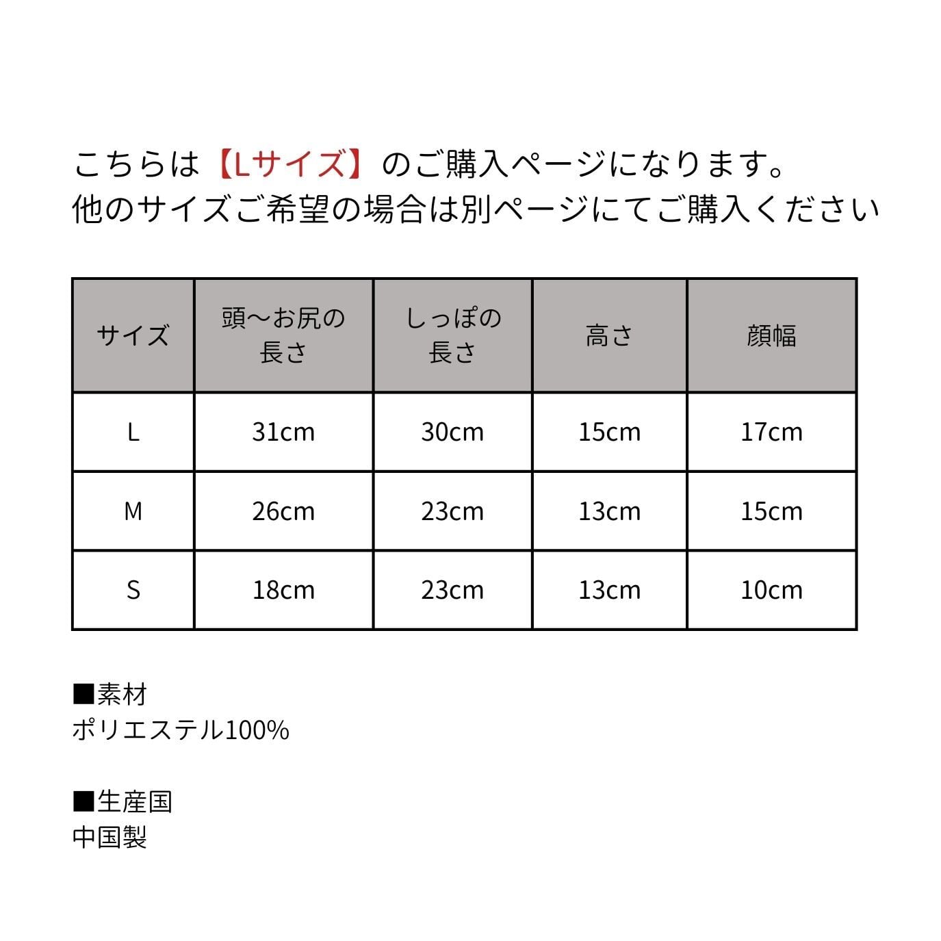Lサイズ:頭〜お尻の長さ31cm, しっぽの長さ30cm, 高さ15cm, 顔幅17cm